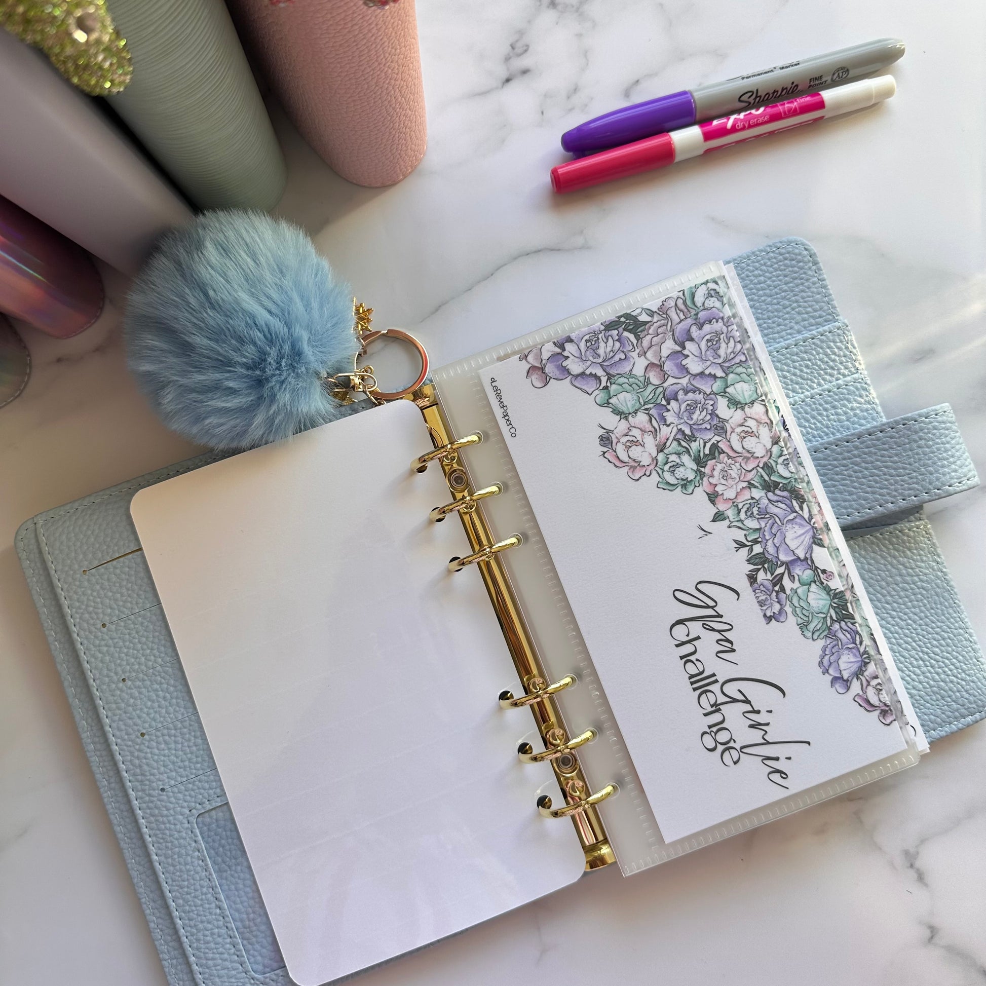 Spa Girlie Savings Challenge envelope is made out of 65lb laminated card stock and poly-vinyl. A6 size and hole punched. Matching savings challenge sold separately.